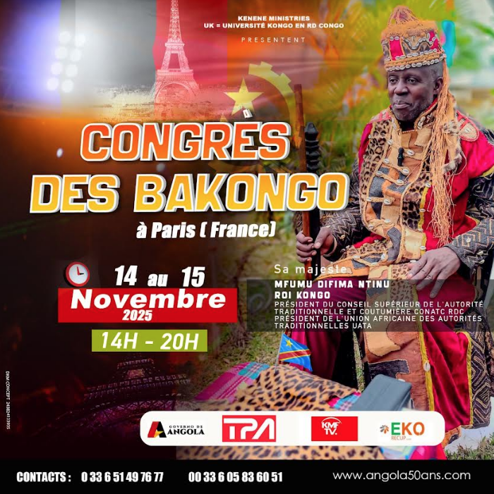 Congrès International et Socio -Anthropologique des Bakongo à Paris. Organisé par Kenene Ministries, en partenariat avec l’Université Kongo (UK) de la RDC, l’Université de Kongo Central, et avec le soutien de l’Ambassade de la République Démocratique du Congo en France, ce congrès réunira chercheurs, chefs traditionnels, étudiants et membres de la diaspora Bakongo autour des enjeux de la mémoire, de l'identité culturelle et de la renaissance africaine.